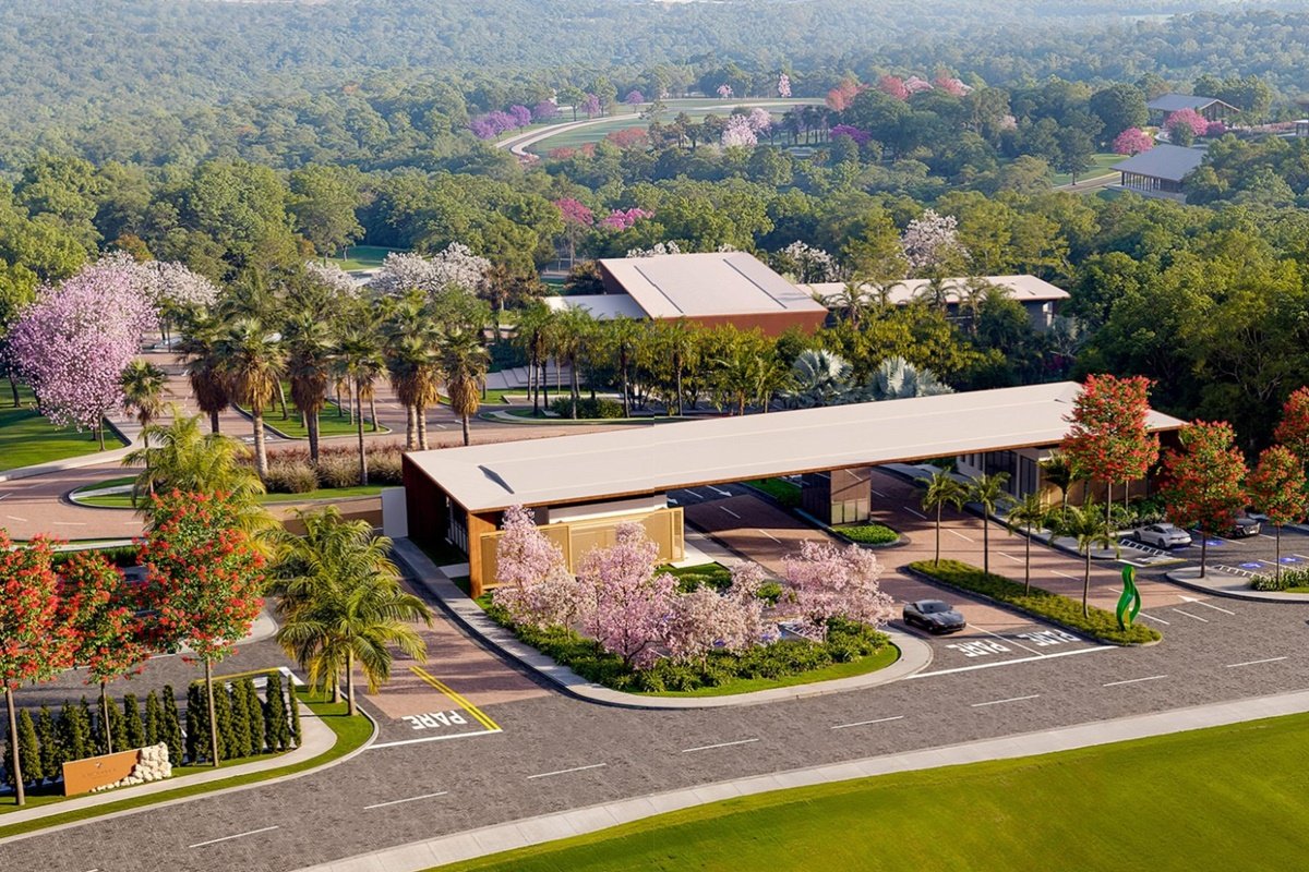 O clube do futuro condomínio Aldeia do Vale deverá oferecer lazer completo entre lagos, jardins e espaços de convivência, mantendo a preservação ambiental em todos os lotes